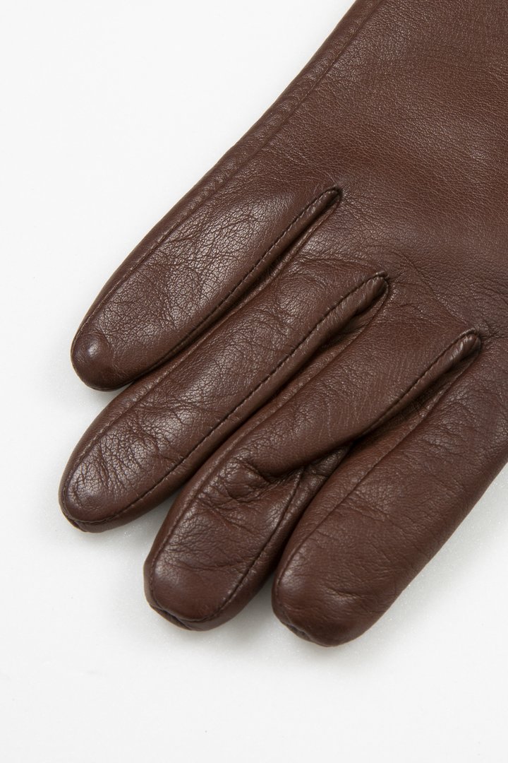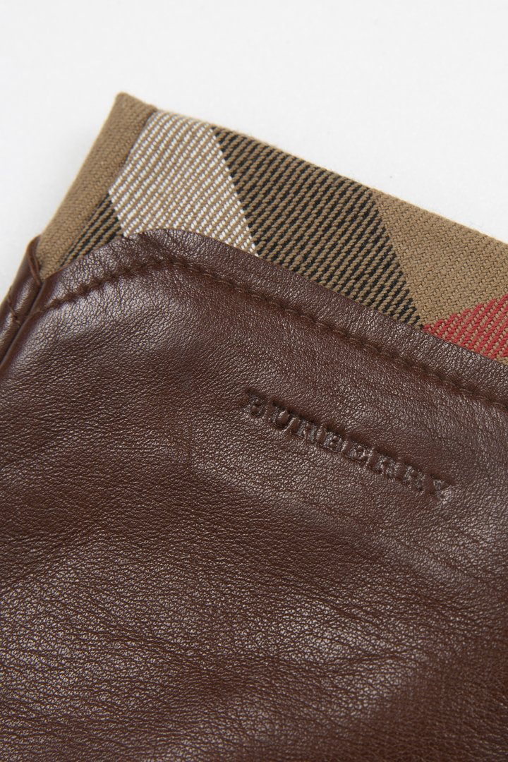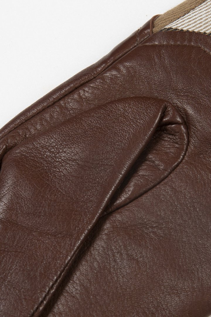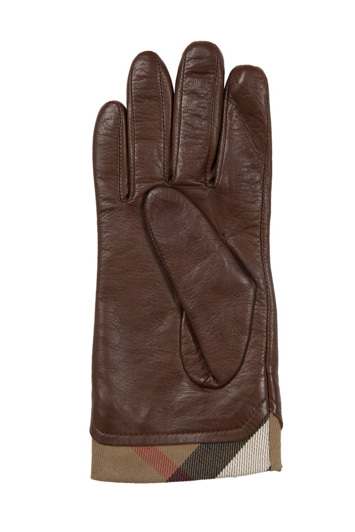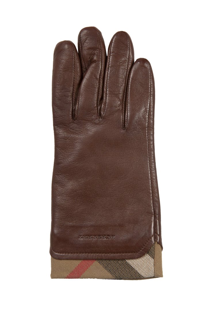 Womenswear glove, single or sample, in dark brown leather, right hand, short length (button length 1.75), punched brand BURBERRY logo at top, inseams, Boulton thumb, fourchettes, notch at inner edge at bottom, edged with panel of woven fabric on the cross in Burberry check design, lined with knitted black wool or wool mix.
