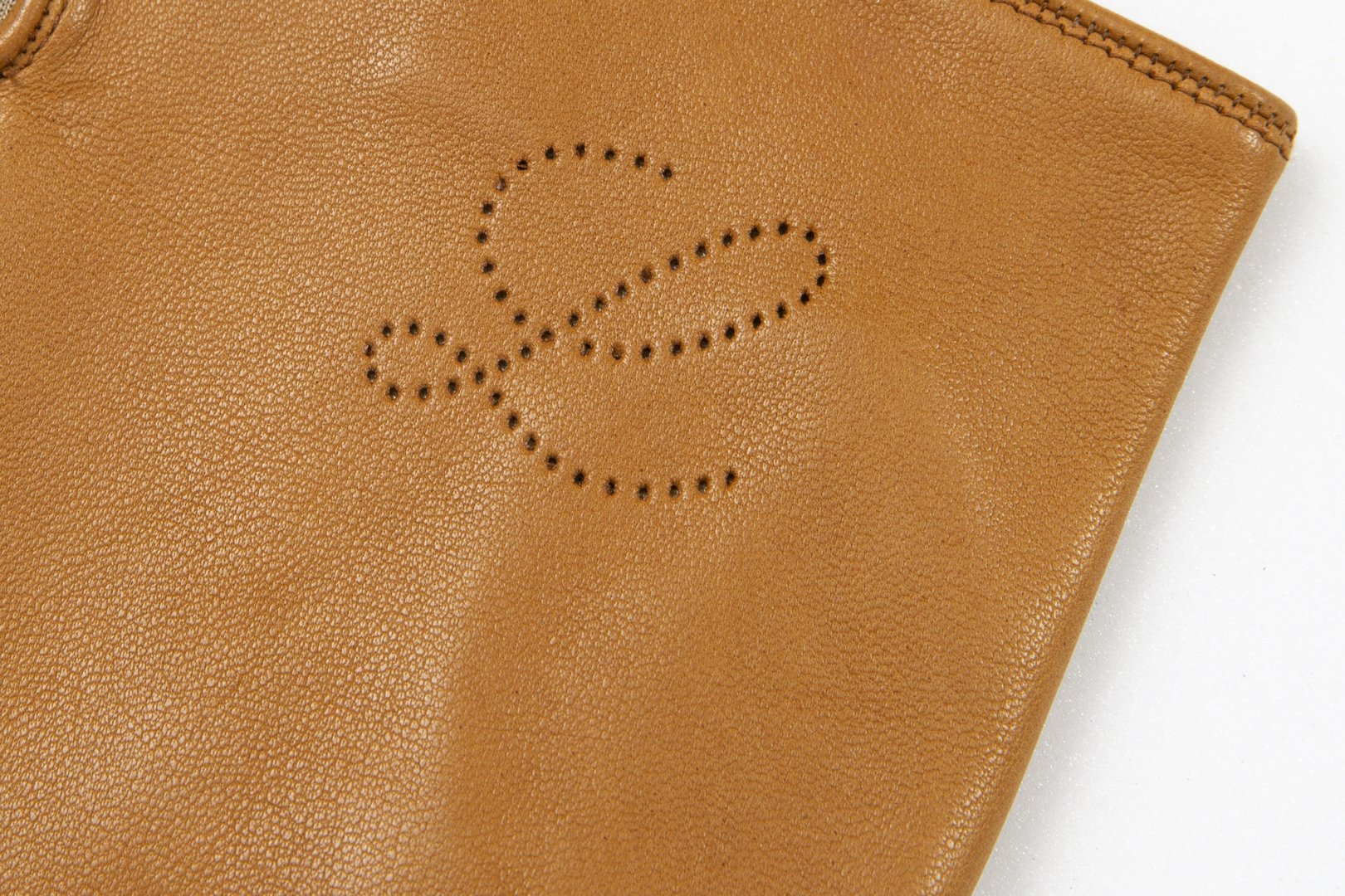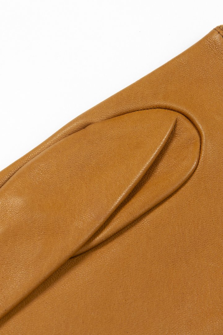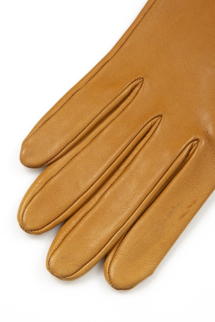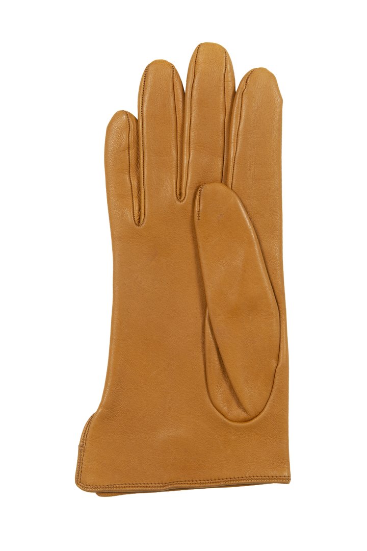Womenswear glove, single or sample, in caramel brown leather, right hand, short length (button length 1.5), punched brand L logo at top, three stitched points, inseams, Boulton thumb, fourchettes, short vent at outside edge, lined in gold-coloured knitted silk