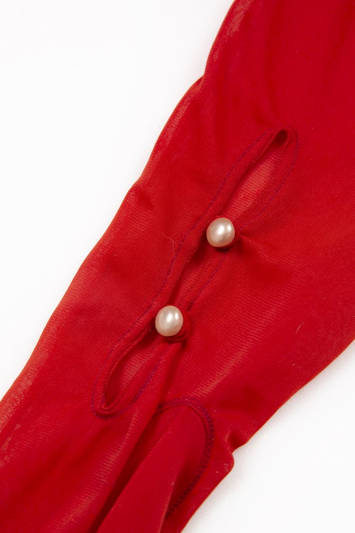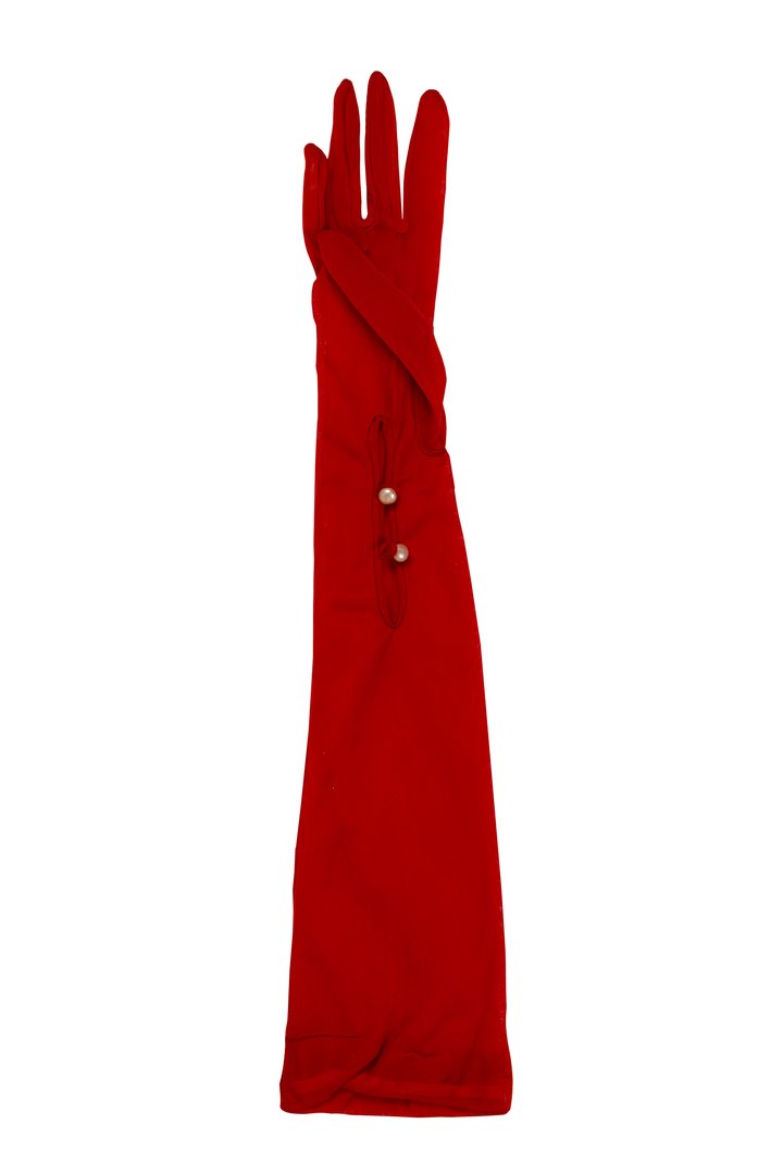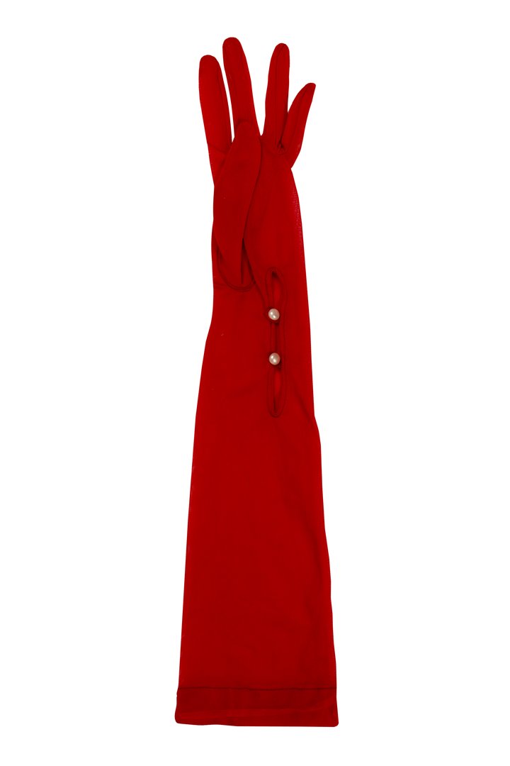 A pair of womenswear gloves in rust red sheer woven synthetic fabric, above wrist length (button length 11), three stitched points, mousquetaire opening with two dome pearl buttons, elastic threaded through casing at top.