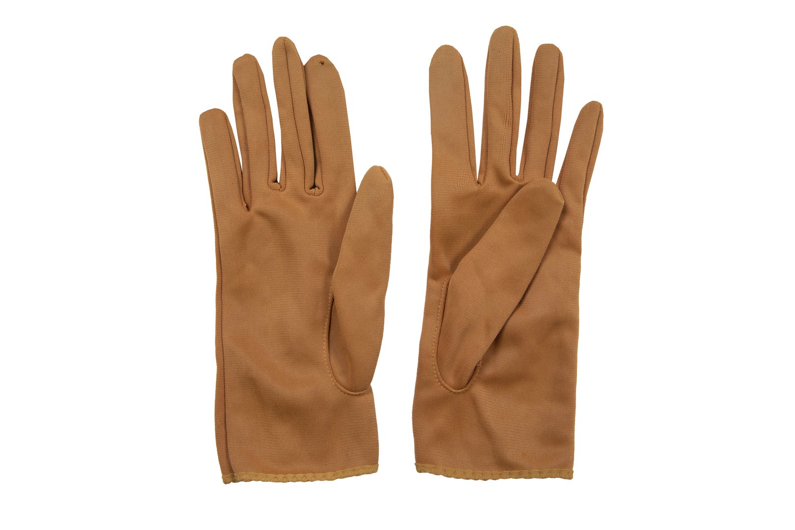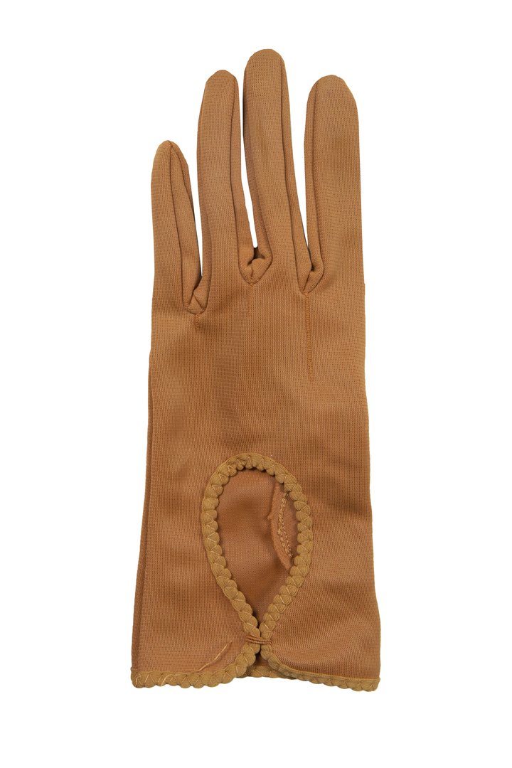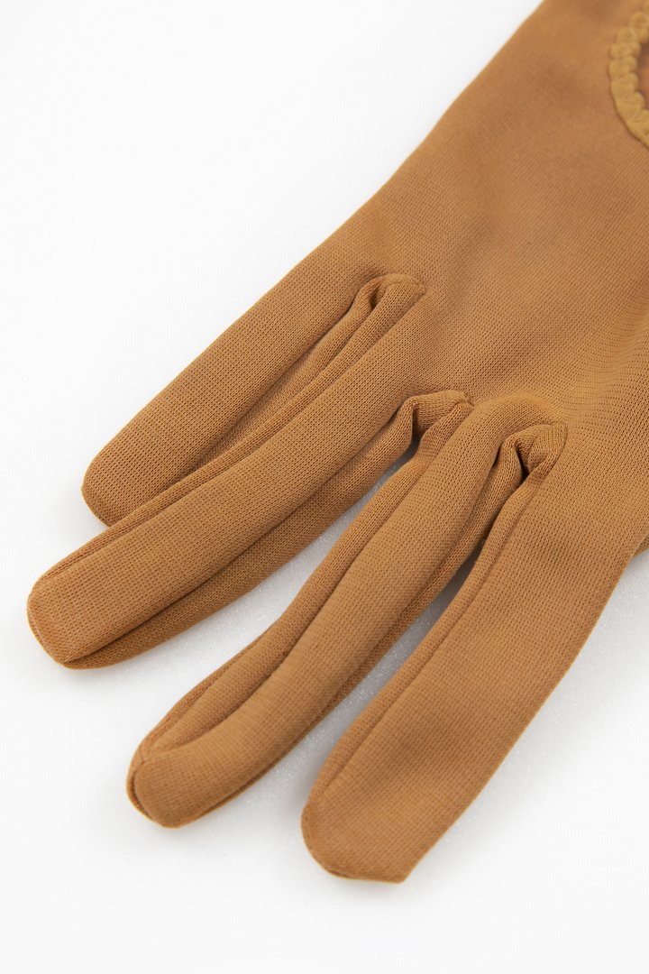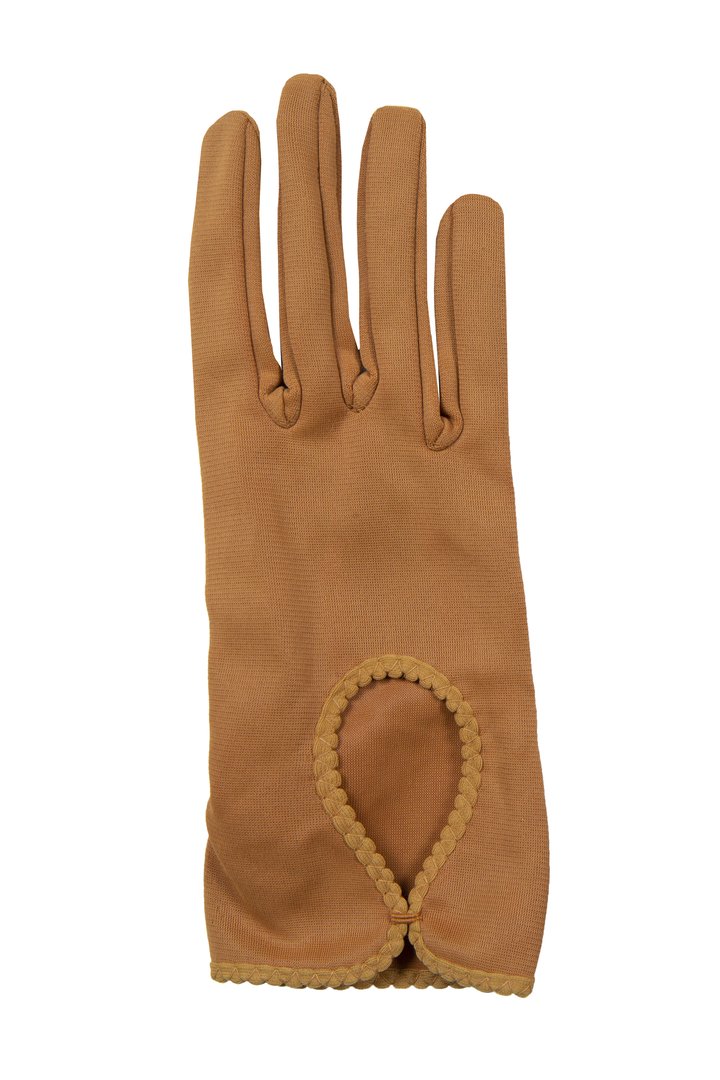 A pair of womenswear gloves in caramel brown nylon simplex fabric, short length (button length 1.25), inseams, keyhole feature on back edged with lighter same fabric and slant stitching.