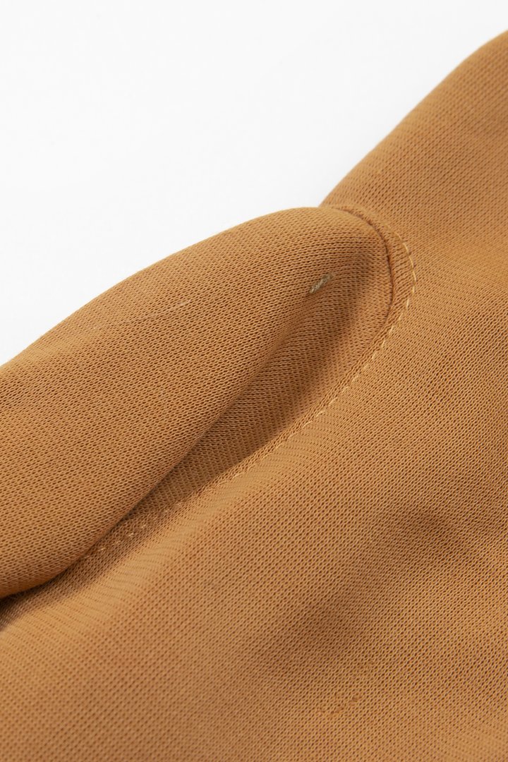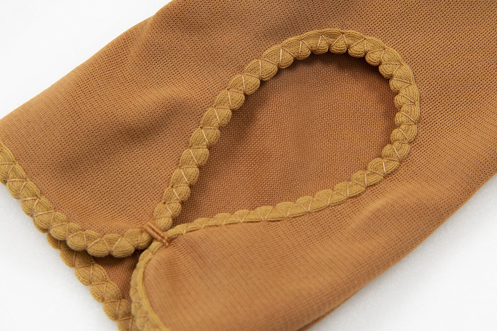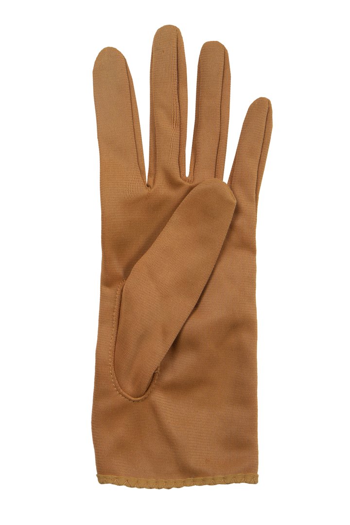A pair of womenswear gloves in caramel brown nylon simplex fabric, short length (button length 1.25), inseams, keyhole feature on back edged with lighter same fabric and slant stitching.