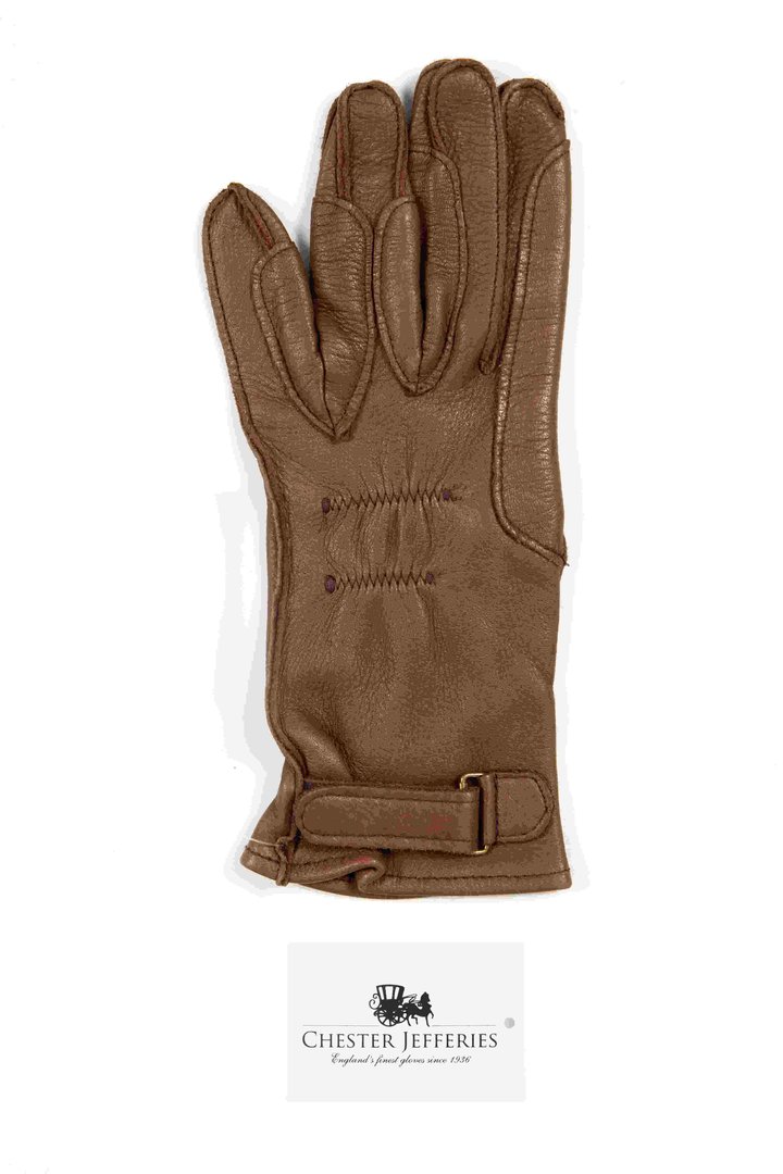 Womenswear carriage driving glove, single or sample, in brown leather, left hand, short length (button length 1.5), outseams, Boulton thumb, padded and shaped fourchettes, two rows of elasticated stitching on back, elasticated at wrist on palm, and above, tab and Velcro closure at wrist on back.