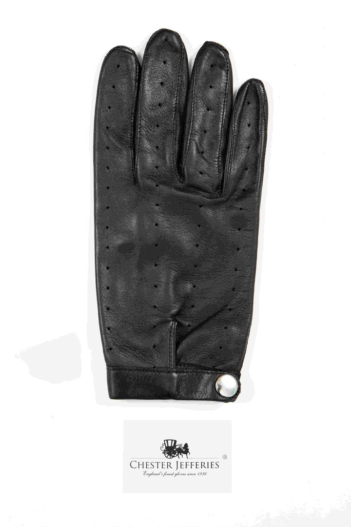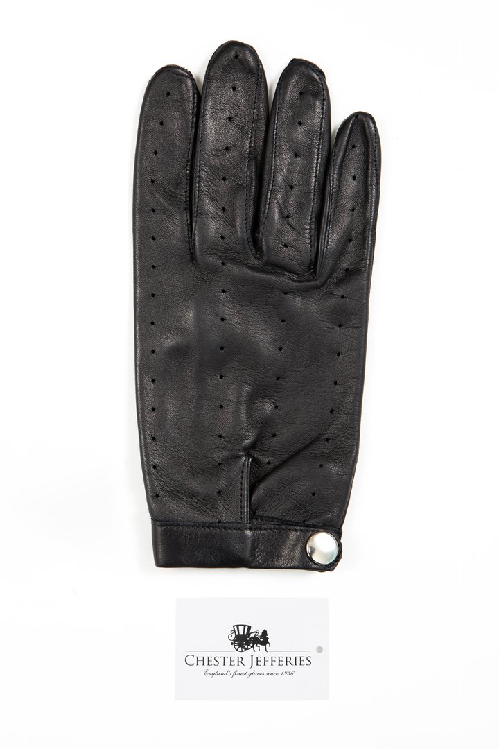 Menswear glove, single or sample, in black leather, right hand, short length (button length 1), outseams, pique stitched, Boulton thumb, fourchettes, quirks, leather punched in line design on back and thumbs, elasticated at wrist on palm, vent tab and silver press stud closure on back.