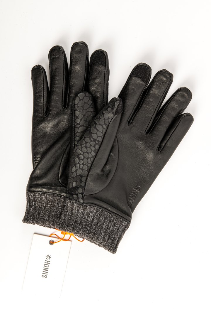 Menswear dress gloves in black leather, with smooth leather on the palm and leather with animal-skin effect design on the back, black suede on index finger tip on palm side, grey synthetic rib knit wrist band with shaped vent effect detail on fronts, orange logo flash at bottom.