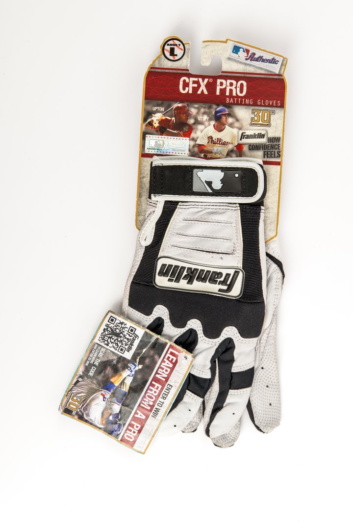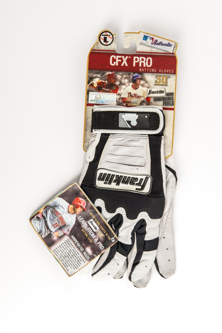 A pair of menswear baseball batting gloves, attached to a header card, in light grey leather and black knit synthetic fabric, Lycra, and neoprene, with light grey leather on palm and back of thumb in design of small holes with perforated holes on back of fingers and front of thumb and striated lines across the palm, black Lycra fourchettes, light grey leather on thumb and tops of fingers with perforated holes and shaped panel at base of fingers, at sides, and panel with slits and logo in applied shaped plastic at bottom, tab and Velcro fastening at wrist on front with deep border of black neoprene, logo in plastic on tab.