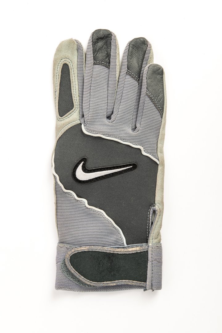 Menswear American football glove, single, sample, in grey and light grey jersey knit synthetic fabric and grey and light grey leather, with light grey horizontal rib knit on fronts and four fingers, dark grey panel with Nike swoosh on back, light grey suede leather on index finger, thumbe and palm and grey leather on three fingertips on front, tab and Velcro fastening at wrist on front with deep border of elastic at wrist.