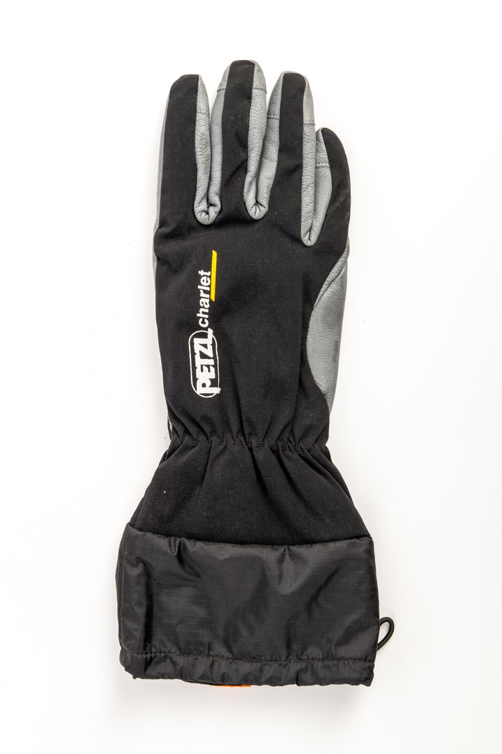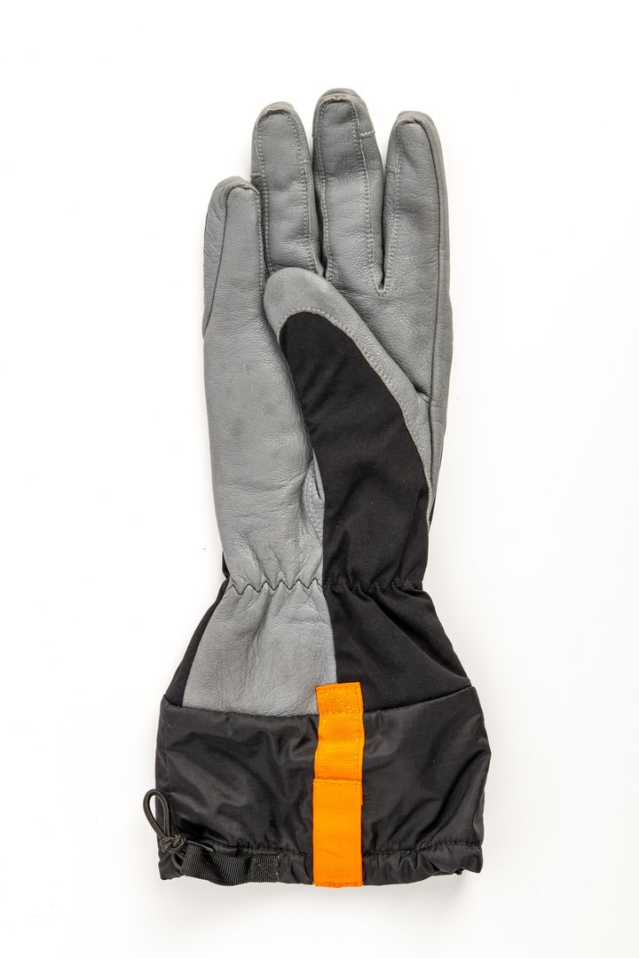 Menswear outdoor glove, single or sample, right hand glove, for outdoor activities and lifestyle market, in grey leather, and black woven synthetic fabric, with grey leather on palm, back of thumb, fourchettes and finger tips, black fabric back, elasticated at wrist, black woven synthetic fabric with small self check at gauntlet cuff with applied orange vertical strip or ribbon, black toggle and drawstring closure at bottom. lined throughout with black fleece.