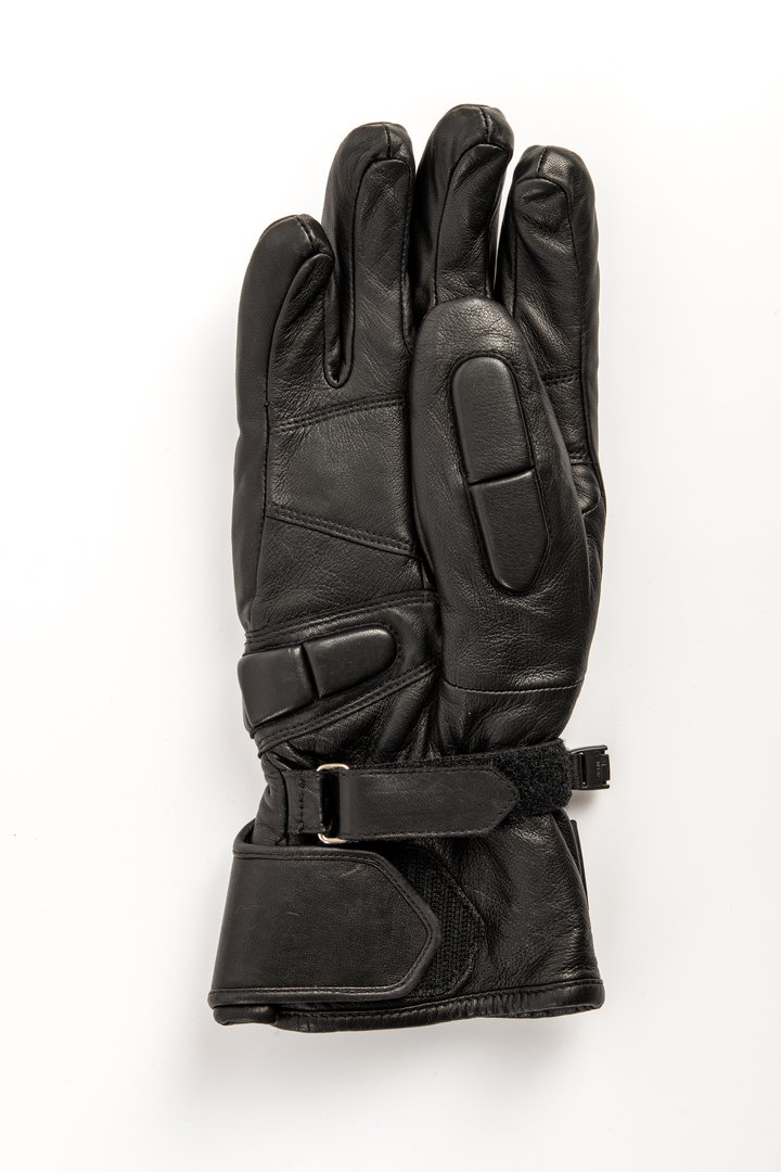 Menswear outdoor glove, single or sample, right hand glove, for fashion or lifestyle market, in black leather, with padded raised ‘knuckle’ panels and shaped ‘pocket’ feature on back of the glove, stitched and re-enforced panel design on palm, elasticated at wrist, strap and silver ring closure at wrist with tab and Velcro closure on gauntlet at bottom, RLX logo stamp on front at bottom on outside edge, small black clasp at inside edge, lined throughout with brown and black woven synthetic fabric