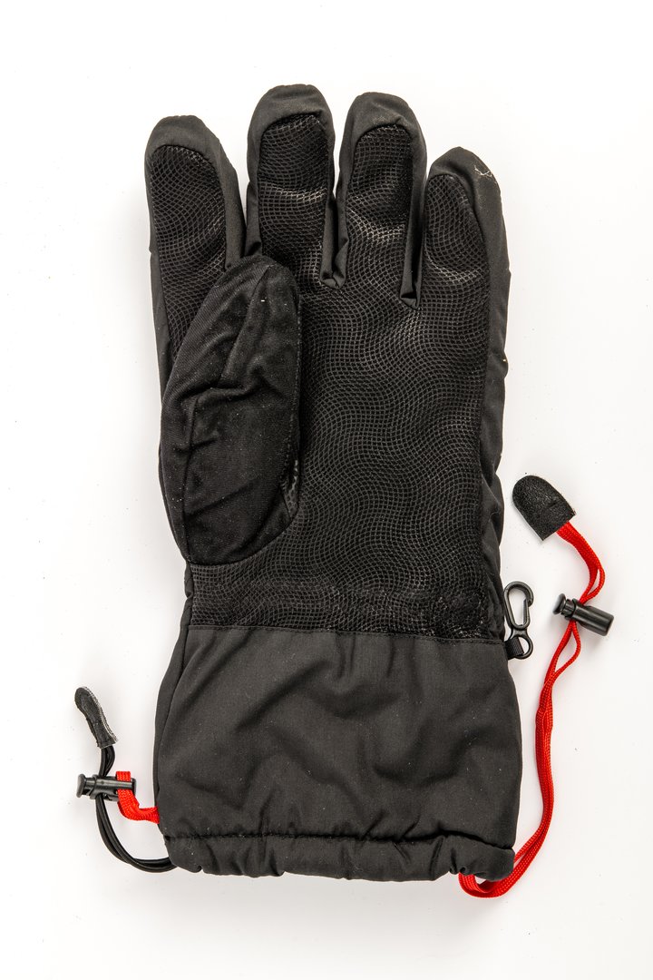Menswear outdoor glove, single or sample, left hand glove, for high performance market, in black leather and black woven fabric, with leather in swirling design on palm, elasticated at wrist, black drawstring and toggle closure and red strap and toggle at bottom, black clasp on outside edge, lined throughout with black fleece.