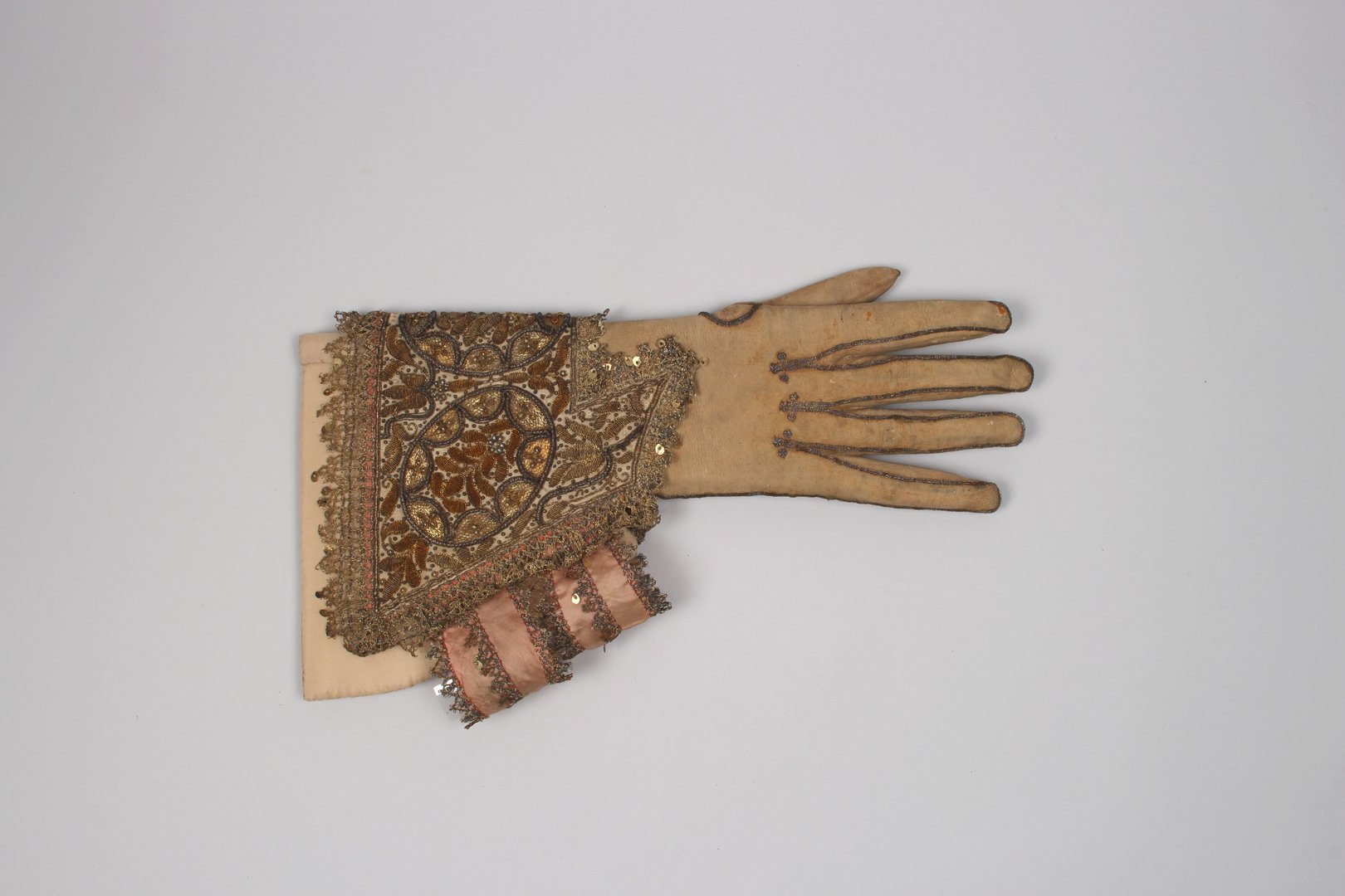 A pair of menswear gauntlet gloves, in dyed buff-coloured suede leather with embroidered design of leaves enclosed in medallions worked in coloured silks, seed pearls and metal threads, edged with gold metal thread bobbin lace.